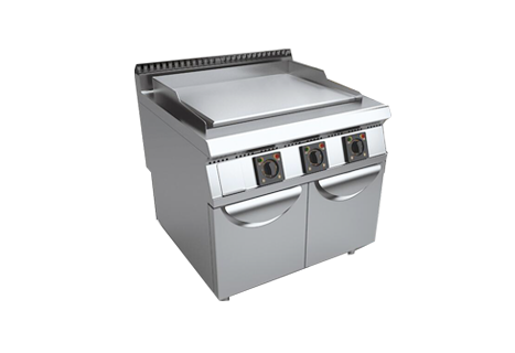 扒爐有臺式和立式兩種。臺式扒爐有平扒爐和坑扒爐兩種,大體結(jié)構(gòu)相似,區(qū)別在:平扒爐表面是一塊1~2cm厚的平整的鐵板,四周濾油:坑扒爐表面是鐵鑄造的倒“T”字形鐵條,都是用燃?xì)?、電或木炭作為能源。鐵板預(yù)熱后,再加油煎制,靠鐵板傳熱,使被加熱體均勻受熱。平扒爐可用于肉類、海鮮加工,還可以煎蛋、炒面、炒飯等;坑扒爐用于肉類、海鮮等塊狀食材加工。臺式扒爐體積小,具有方便、衛(wèi)生、受熱均勻的效果。