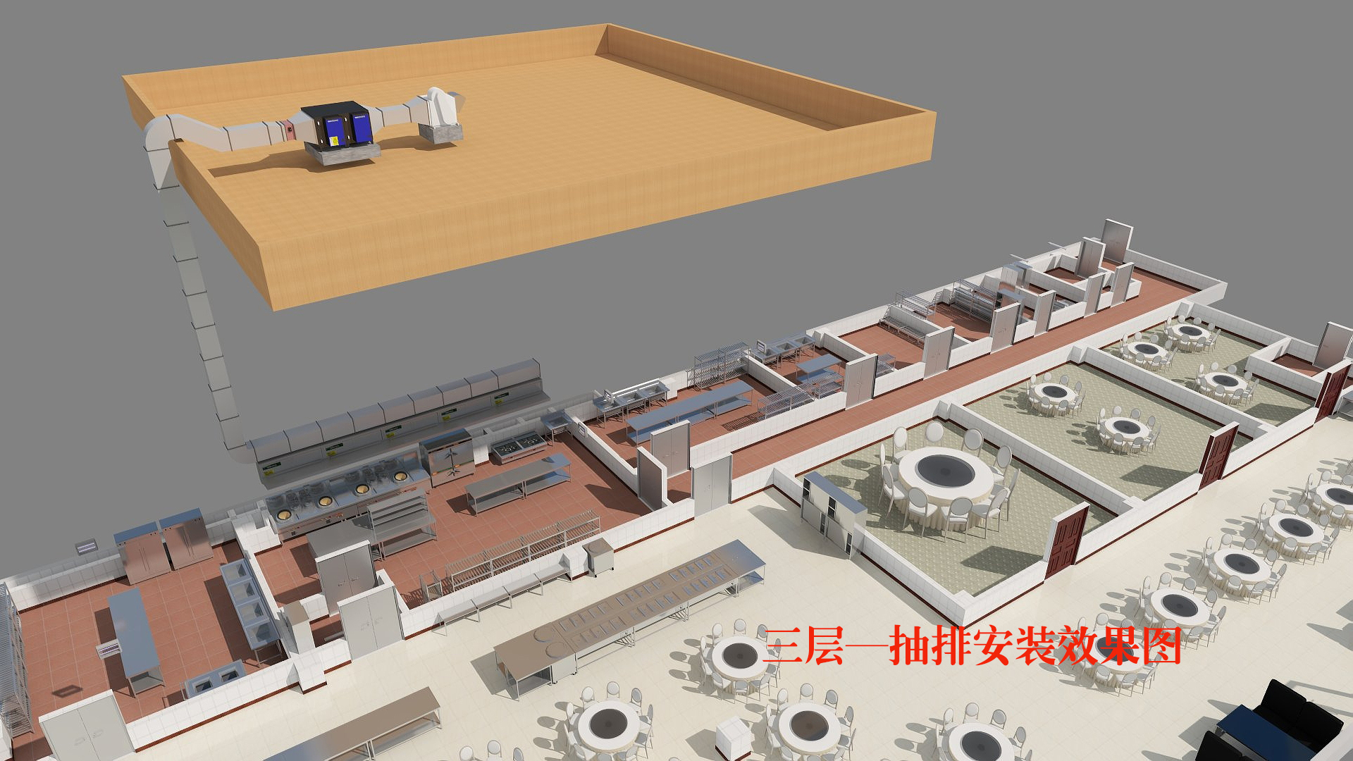 (3)由于建筑設計單位不便深入了解廚房現(xiàn)場實際和廚房的要求,所以大多由廚房專業(yè)進行二次設計。由于廚房空間異常緊張.廚房排通風系統(tǒng)設計必須提高設計深度。對管道大小、走向、轉彎、進出口、與其他管線空間關系必須清楚。在設計時就需要考慮施工細節(jié)。由于施工有誤差和變更等因泰,實際空間大小必須實地準確測量.才能保證施工質量。例如,風機就位安裝,在設計時就要清楚風機的大小、重量、與周邊空間關系,能否運送到位、是否有足夠的安裝檢修空間和荷載。所以,除土建、電力部分需要設計部門后續(xù)設計之外,廚房排煙通風系統(tǒng)設計制圖應該滿足施工要求。