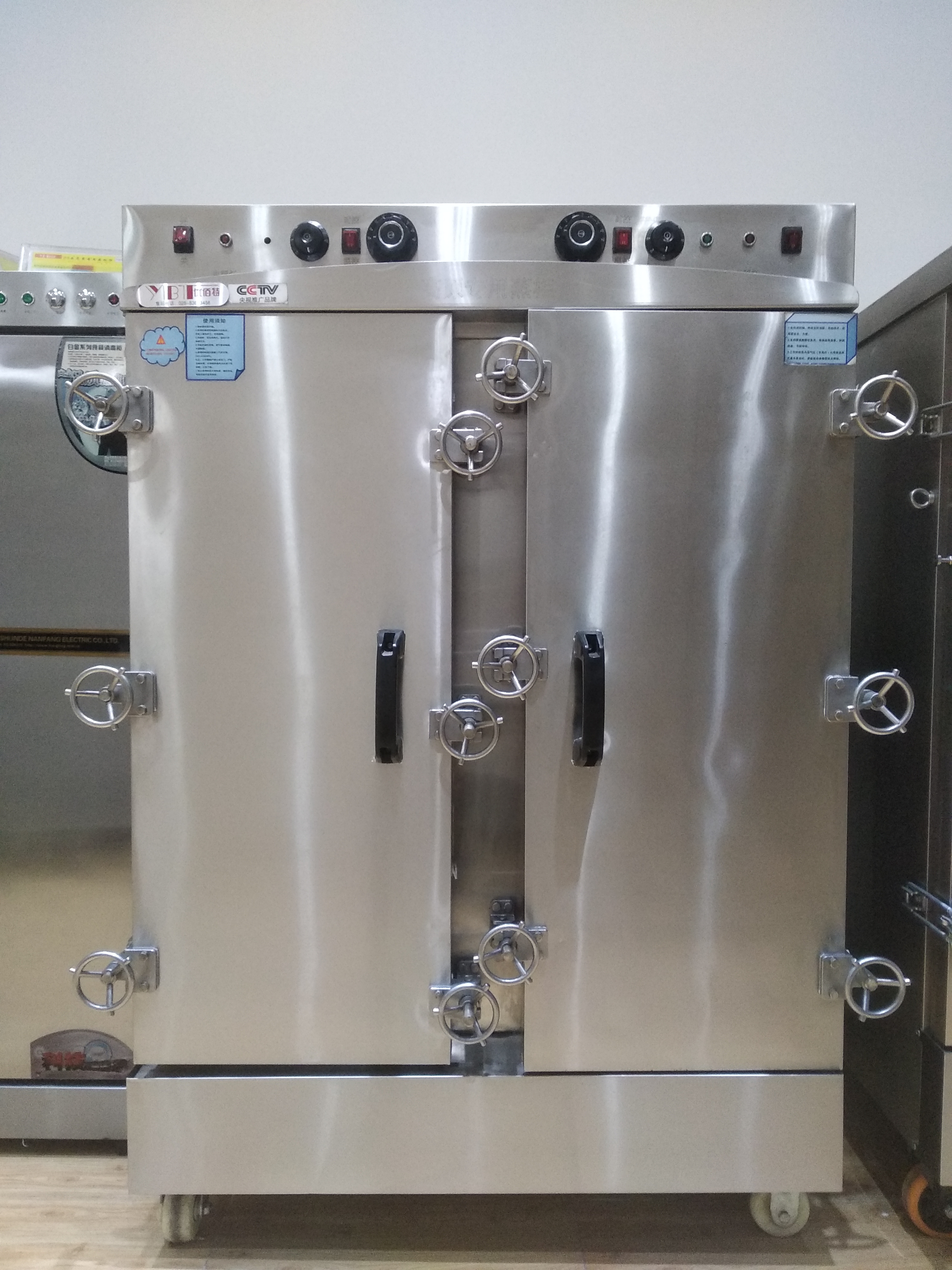 1. 蒸飯柜利用電、燃?xì)獍l(fā)熱,是大型廚房的烘烤設(shè)備。內(nèi)部采用不銹鋼方盤(pán)作為容器,在蒸汽柜的下方,為了方便移動(dòng),安裝有萬(wàn)向輪,外形像車,所以又叫做蒸飯車。