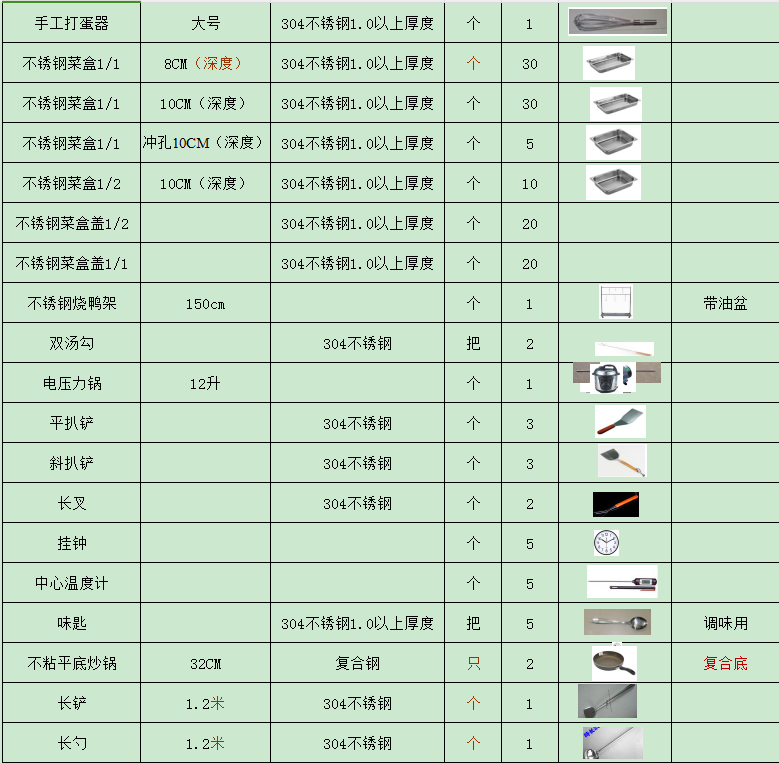 5、明確廚房設備產(chǎn)品牌。特別是外協(xié)設備、進口設備、電器設備等,不同質(zhì)量價格差別巨大,質(zhì)量也自然不等。自產(chǎn)產(chǎn)品可以用“廠制品”明確表明。