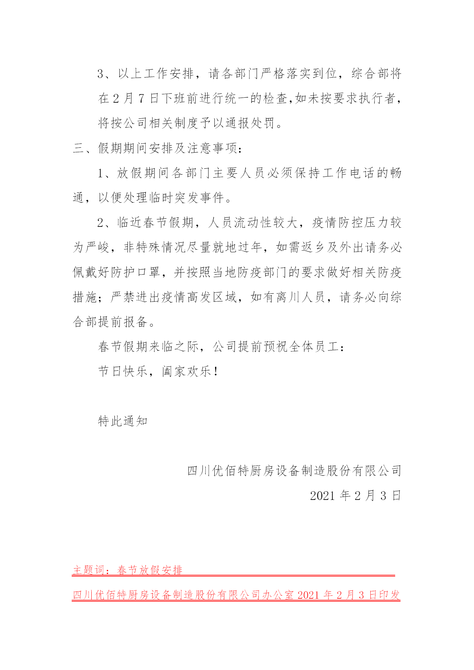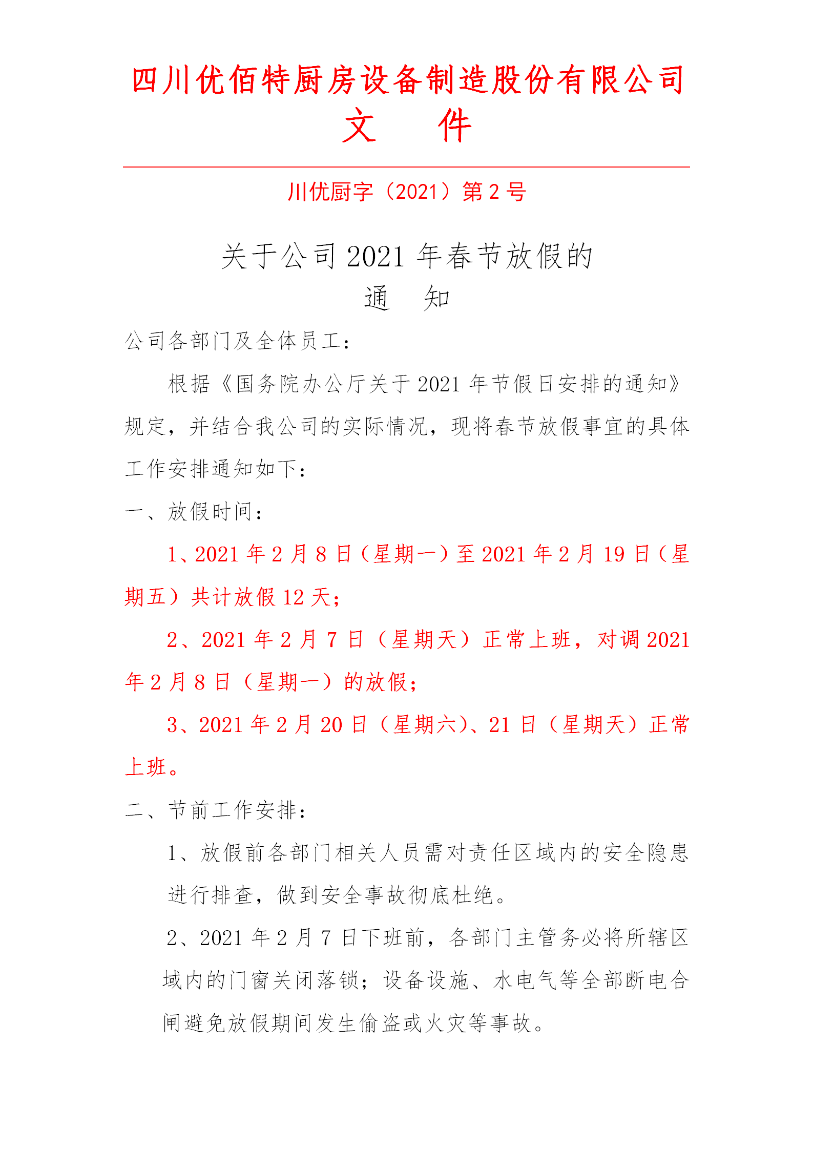 感謝你這一年來對四川優(yōu)佰特廚房設(shè)備制造股份有限公司的支持,春節(jié)假期將至,優(yōu)佰特公司祝你和你的家人新春快樂,財源廣進(jìn),萬事如意。我公司根據(jù)《國務(wù)院辦公廳關(guān)于2021年節(jié)假日安排通知》,并結(jié)合我公司實(shí)際情況,對春節(jié)放假做出如下安排: