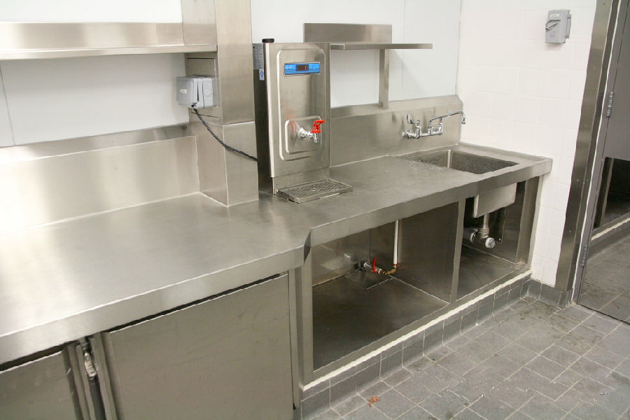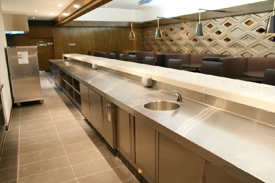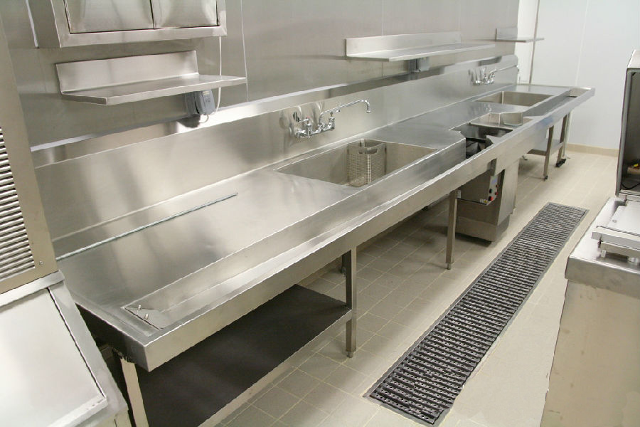 依然是一流的現(xiàn)場無縫焊接工藝,臺(tái)面非常平整,對土建(地臺(tái)施工),現(xiàn)場焊接工藝,調(diào)理臺(tái)的制造工藝要求非常高。工作臺(tái)的背板用大弧度L型設(shè)計(jì),避免藏污納垢,容易清洗。