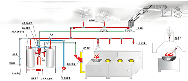 3、廚房專用滅火裝置:廚房專用滅火裝置是由滅火劑儲瓶與關(guān)斷燃料閥機(jī)構(gòu)、機(jī)械驅(qū)動裝置、霧化與噴頭管網(wǎng)、感溫易熔金屬探測器與控制管路、手動應(yīng)急啟動等組成。廚房安裝該系統(tǒng)之后,可24小時不間斷的對廚房的灶臺、集油煙罩、排煙管道進(jìn)行全方位的消防保護(hù)。